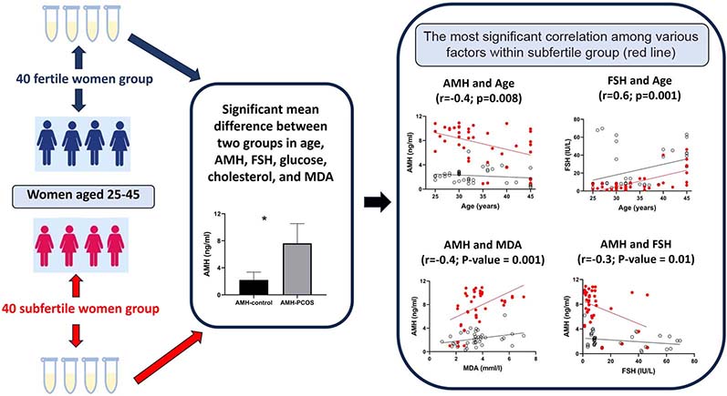Results and Discussion. FSH levels were positively correlated with age while AMH was related to age inversely, suggesting that aging decreases ovarian reserve in PCOS women. Furthermore, a significant increase in mean serum Malondialdehyde (MDA) was observed for the women with PCOS group compared to healthy controls, aligning with a significant association among AMH and MDA. Remarkably, no statistically significant correlation between FSH and AMH was found relating glucose, and total cholesterol (TC) in the PCOS group. Therefore, the monitoring of these indicators could enhance the clinical care of PCOS.